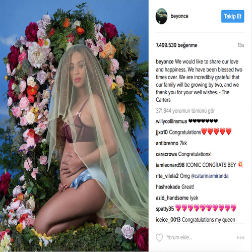 Bilindiği üzere Beyonce ve Jay Z çiftinin Rumi ve Sir Carter kısa bir süre önce dünyaya gelmişti. 11,1 milyon beğeni alan Beyonce’nin Instagram sayfasında 108 milyon takipçisinin bulunduğunu da belirtelim. Instagram’da en çok takipçisi olan sanatçı ise Selena Gomez. 130 milyon takipçisi bulunan Selena Gomez’i 116 milyonla Christiano Ronaldo ve 115 milyon takipçiyle Ariana Grandetakip ediyor.