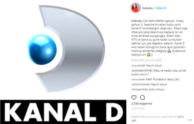Ailem olan NTV'ye bana bu güne kadar sundukları katkılar için çok teşekkür ederim. Kanal D Ana haber koltuğunu bana layık görenleri mahcup etmemek dileğiyle. Dualarınızı bekliyorum" dedi.