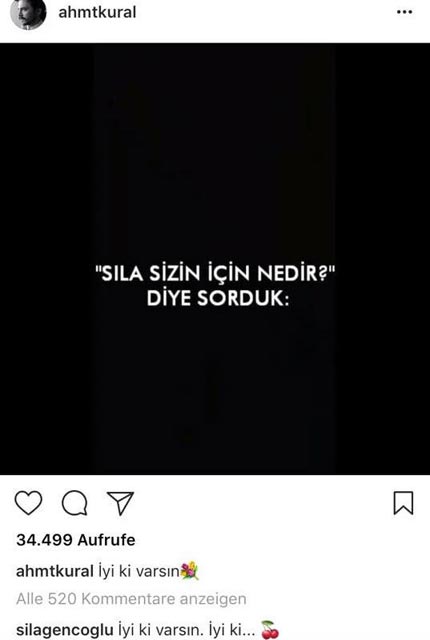 Sevgilisinden gelen bu jeste karşılıksız kalamayan Sıla, Ahmet Kural'ın paylastığı video'nun altına 'Iyi ki varsın iyi ki' notuyla karşılık verdi. Sıla ve Ahmet Kural çifti, sessizliklerini bozarak, böylelikle aşklarını onaylamış oldu.