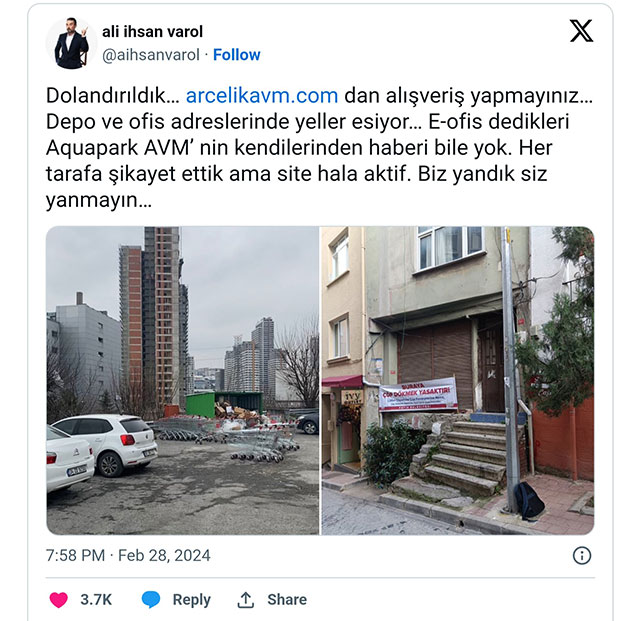 İnternet üzerinden alışveriş yapan Ali İhsan Varol, firmanın depo ve ofis adresine girdiğinde dolandırıldığını anladı. Sosyal medya hesabından uyarıda bulunan Varol, "Dolandırıldık… https://arcelikavm.com dan alışveriş yapmayınız…