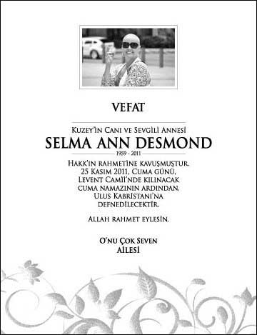 Acı haberin ardından aralarında Acun Ilıcalı, Gökhan Şükür gibi bir çok ünlü isim Desmond'un evine geldi. Cenaze evden Gökhan Şükür'ün de aralarında bulunduğu 7-8 kişilik bir grup tarafından çıkartıldı. Selma Ann Desmond'un cenazesi yarın Levent Camii'nde kılınacak cuma namazının ardından Ulus Mezarlığı'na defnedilecek..