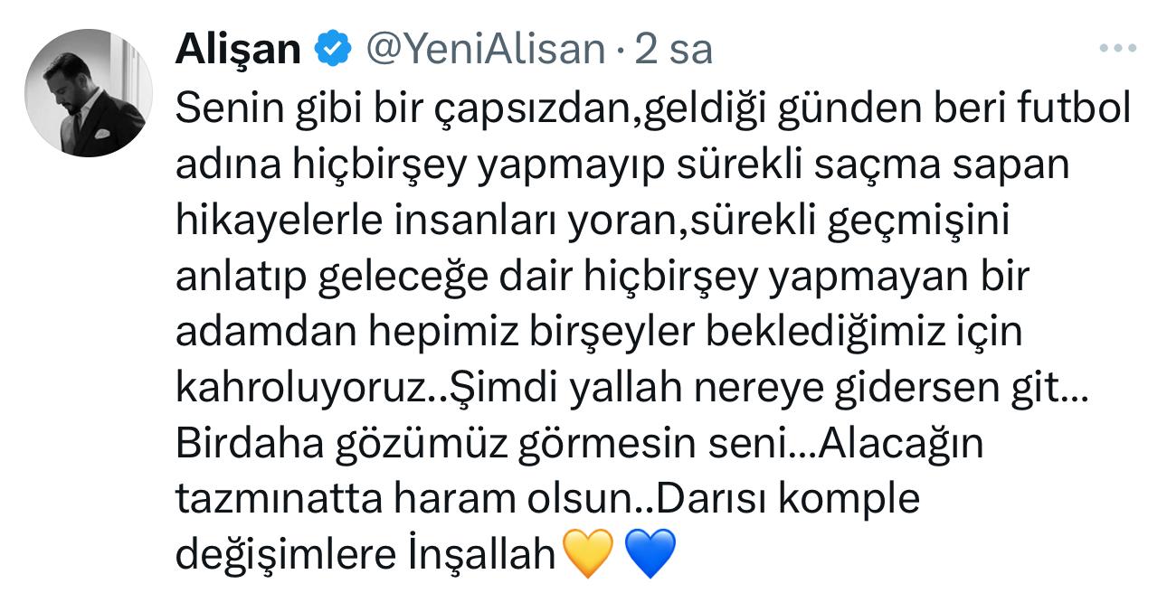 Alişan, paylaşımında şu ifadeleri kullandı: “Senin gibi bir çapsızdan, geldiği günden beri futbol adına hiçbir şey yapmayıp sürekli saçma sapan hikayelerle insanları yoran, sürekli geçmişini anlatıp geleceğe dair hiçbir şey yapmayan bir adamdan hepimiz bir şeyler beklediğimiz için kahroluyoruz. Şimdi yallah nereye gidersen git… Bir daha gözümüz görmesin seni… Alacağın tazminatta haram olsun!”