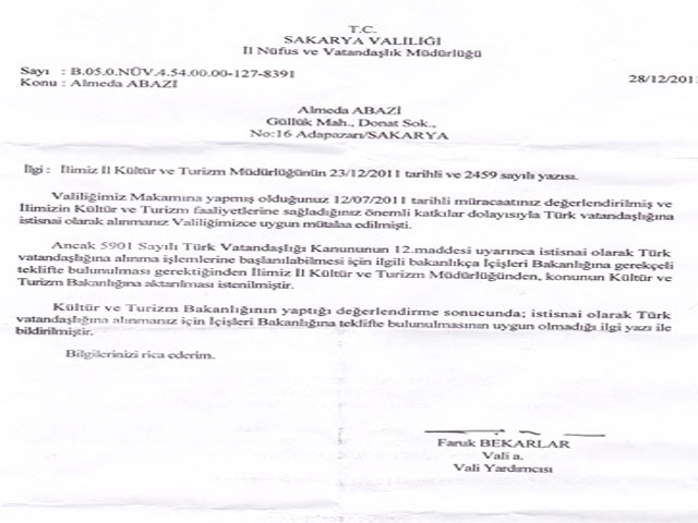 Girdiği bir güzellik yarışmada, birinci seçilmesinin ardından geldiği İstanbul'da, özel bir liseyi bitirdikten sonra, Sakarya Üniversitesi'ne yabancı kontenjanından kayıt olan Arnavut Asıllı Almeda Abazi'nin Sakarya Valiliğine verdiği Türk Vatandaşlığı di