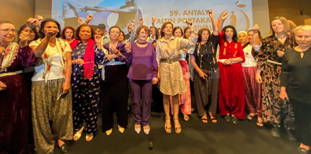 Antalya Altın Portakal Film Festivali'nde yönetmen Jale İncekol'un, 20 kadının yolculuğunu anlattığı belgeseli 'Narperi'nin Bileziği' izleyiciyle buluştu. Film ekibi ve oyuncular, gösterim sonunda, İran'da saçı gözüktüğü gerekçesiyle polis tarafından gözaltına alındıktan sonra hayatını kaybeden Mahsa Amini'yi anmak için saçlarını kesti.