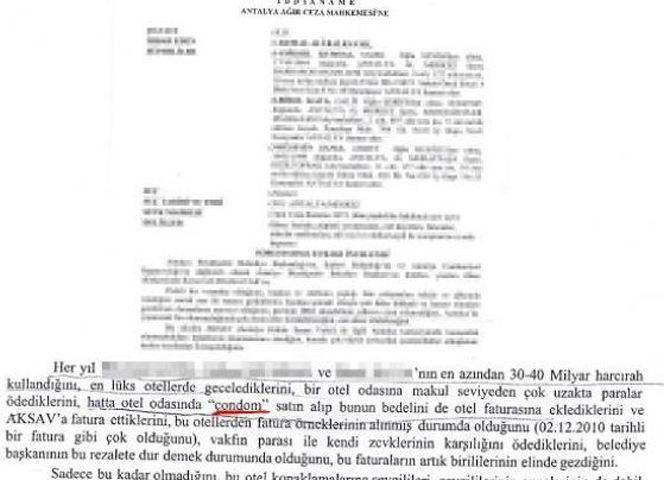 Kemal A.B.'nin ihbar mektubunda, AKSAV Genel Müdür Vekili Göksel K., Genel Müdür Yardımcısı Birol K. ile AKSAV İcra Kurulu üyesi Hüseyin Ş.'nin, görevli olarak gittikleri İstanbul'da konakladıkları otelde makul seviyeden çok daha fazla miktarda harcama yaptıkları, hatta otel odasında kondom satın alıp, bunu da AKSAV'a fatura ettikleri, AKSAV'ın parasını kendi zevkleri için harcadıkları öne sürerek, Başkan Akaydın'dan bu rezalete 'dur' demesinin beklendiği yazıldı. İhbarda, bu görevlilerin otel konaklamalarına sevgilileri ve sevgililerinin annelerinin de dahil olduğu ve bunların parasının da AKSAV tarafından ödendiği ileri sürüldü.