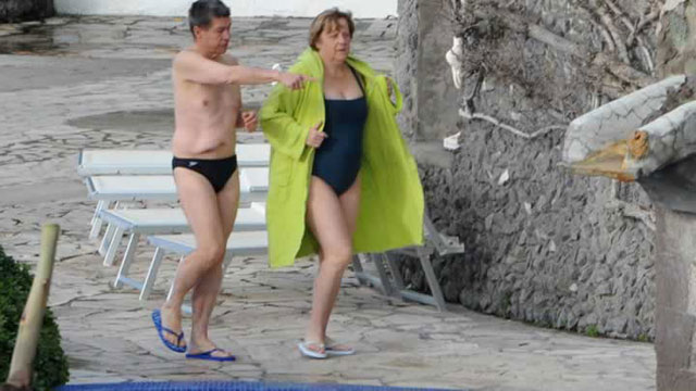 İtalya'nın Napoli kenti yakınlarındaki Sant'Angela d'Ischia kasabasında bulunan bir otelde tatil yapan Merkel ve Sauer çifti, mayolarını giyerek otelin termal havuzunda yüzdü.
