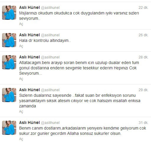 Geçtiğimiz günlerde basit bir kist ameliyatı için bıçak altına yatan ve kalp ritminde gerçekleşen bozukluk dolayısıyla GATA'ya sevk edilen Aslı Hünel, yoğun bakımdaki tedavisinin ardından geçtiğimiz hafta evinde dinlenmek üzere taburcu edilmişti. Bu süre içerisinde sosyal medyadan da uzak kalan güzel assolist bugün twitter adresinden bir mesaj yayınladı