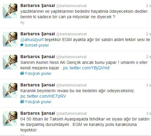 Barbaros Şansal, olayın ardından çektiği fotoğrafları twitter sayfasında yayınladı. Şansal, fotoğrafların altına "Saat 04:50 itibarı ile Taksim Ayaspaşa'da tehditkar ve siyasi ağırlıklı bir saldırı ile darp almış durumdayım. Karanlık beyinlerin revası bu işin bedelini ağır ödeyeceksiniz. Yazdıklarının ve yaptıklarının bedelini hayatınla ödeyeceksin dediler, benim ki sadece bir can ya milyonlar ne diyecek?" notunu düştü