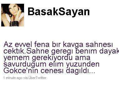 Sayan talihsiz olayı twitter'da şöyle paylaştı: "Az evvel fena bir kavga sahnesi çektik. Sahne gereği benim dayak yemem gerekiyordu ama savurduğum elim yüzünden Gökçe'nin çenesi dağıldı..."
