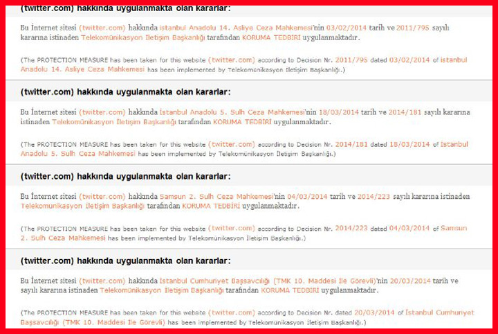 İlk olarak Kablonet'ten twitter'a bağlanmak kullanıcılar, "Bu sitenin (twitter.com) hakkında İstanbul Cumhuriyet Başsavcılığı'nın 20/03/214 tarih ve sayılı kararına istinaden Telekomünikasyon İletişim Başkanlığı tarafından koruma tedbiri uygulanmaktadır" bilgilendirmesiyle karşılaştılar.
