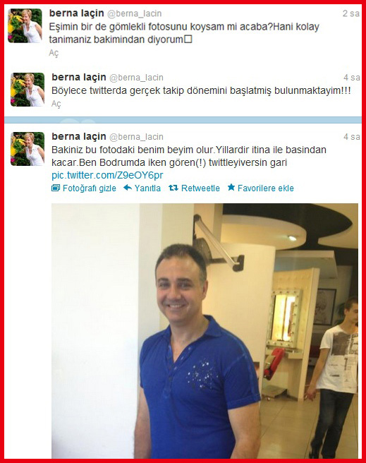 "Bakınız bu fotoğraftaki benim beyim olur. Yıllardır itina ile basından kaçar. Ben Bodrum'da iken gören twitleyiversin. Böylece Twitter'da gerçek takip dönemini başlatmış bulunmaktayım."