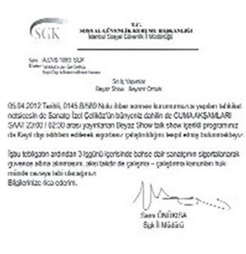 "05.04.2012 tarihli, 0145.B/589 No.'lu ihbar sonrası kurumumuzca yapılan tahkikat neticesinde, sanatçı İzel Çeliköz'in bünyeniz dahilinde cuma akşamları saat 23.00-02.30 arası yayınlanan 'Beyaz Show' talk show içerikli programınızda kayıt dışı istidam edilerek sigortasız çalıştırıldığını tespit etmiş bulunmaktayız. İşbu tebligatın ardından 3 işgünü içerisinde bahse dair sanatçının sigortalanarak güvence altına alınmasını, aksi takdirde cezaya tabi olacağınızı, bilgilerinize rica ederim."