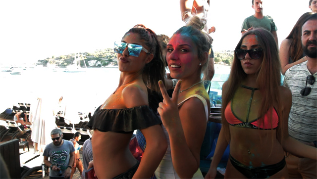 Çeşme’nin en gözde mekanlarından biri olan Aya Yorgi Kafepi gökkuşağı renklerine boyandı. Daha önce Bodrum Yalıkavak’taki Zayo Beach, ardından Kafe Pi’de yapılan ve boyalı tozlarla eğlenen tatilcilerin yeni adresi bu defa Çeşme oldu.