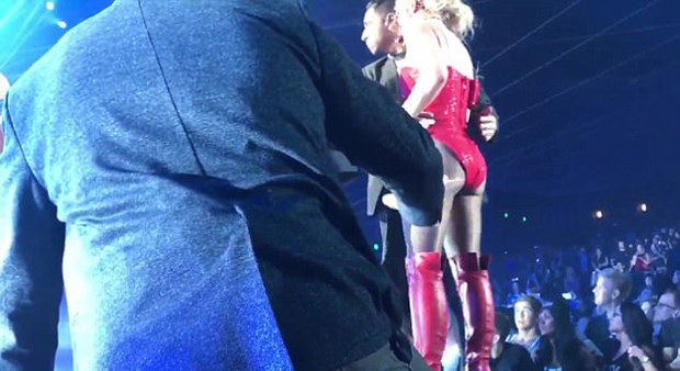 Kimliği açıklanmayan erkek hayran, 35 yaşındaki pop yıldızı "Crazy" isimli şarkısını söylerken sahneye çıktı.