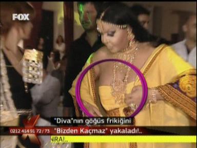 Antalya'da bir akrabasının düğünü şerefine sahneye çıkmaya hazırlanan Bülent Ersoy, masadan kalkarken elbisesinin azizliğine uğradı. Diva'nın kopçası kopunca, sağ göğsü aniden dışarı fırladı!