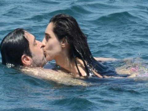 İskelede bile el ele yürüyen çift, denizde de romantizm yaşamaya devam ettiler. Çiftin bir yandan yüzüp bir yandan öpüştükleri anlar, objektiften kaçmadı.