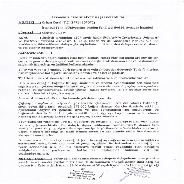 Çağatay Ulusoy'un Instagram hesabında sigara içerken paylaştığı fotoğraflarla savcılığa gelen Kural, Ulusoy'un gençleri sigaraya özendirdiği ve tütün ürünleriyle ilgili düzenlenen kanunu ihlal ettiği gerekçesiyle cezalandırılmasını talep etti.
