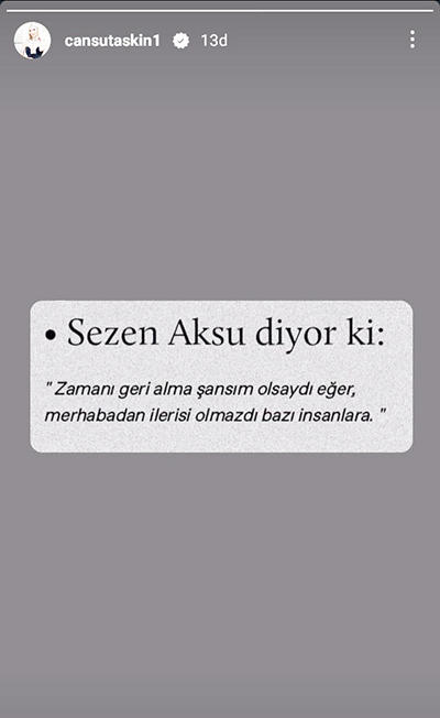 Yılmaz Erdoğan ile yaşadığı aşk ile adını duyuran ünlü fenomen Cansu Taşkın'dan eski sevgilisine "Sezen Aksu'lu" gönderme geldi. Ünlü fenomen Taşkın’ın bu paylaşımı yeni bir aşka başlayan Yılmaz Erdoğan'a gönderme olarak yorumlandı.