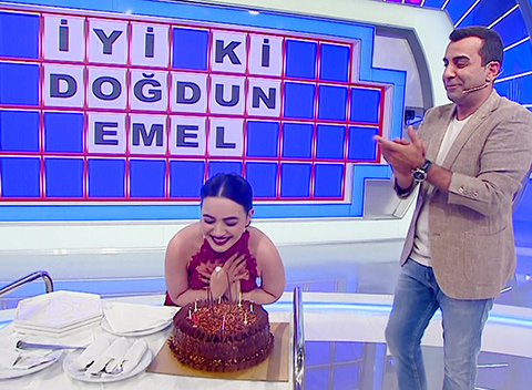 Etap sorusunu anons ettiği sırada toblerone’da “İyi ki doğdun Emel” yazısının belirmesi ile büyük şaşkınlık yaşayan Özkızıltaş, doğum günü pastasını Emre Karayel ile beraber kesti.