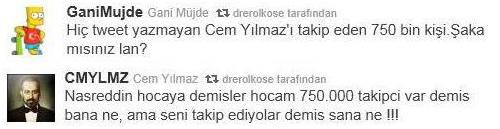 Twitter'da Gani Müjde'nin kendisine çaktığını gören (büyük ihtimalle abisi Can Yılmaz tarafından uyarılan) Cem Yılmaz "Nasreddin hocaya demişler hocam 750.000 takipçi var demiş bana ne, ama seni takip ediyorlar demiş sana ne !!!" diye yazarak cevap verdi.