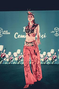 İpekçi’nin Lale Müzesi’ne hediye etmek üzere hazırladığı, yapay zeka ile oluşturulan lale deseninin basıldığı 50 metre kumaşın ve 25 kilogram Swarovski taşın kullanıldığı 3 kıyafet ve saç aksesuarı izleyicilerden büyük alkış aldı.