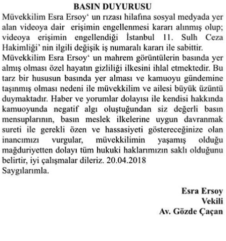 'Hastaneye yatma sebebimiz olanlar utansın. Konuşmaya devam edin karşınızdakiler zaten insan değil duyguları yok, gururu yok konuşun konuşun. Vicdanınız rahat olsun. Sarhoştum çok içmiştim ne dediğimi ne yaptığımı hatırlamadığım bir video yolladım daha önceden bir ilişki yaşadığım birine. Ve o videoyu kardeşim kesinlikle servis etmedi bunu da yanlış haber olarak yapmayın. O videoyu ben sadece tek bir kişiye yolladım. Ondan sonrası böyle oldu. Kim yaydı nasıl oldu bilmiyorum ama ben çok kötü günler geçiriyorum. Bu arada videodaki erkek de erkek arkadaşımdı o bana hata yaptı, ben de onu sinirlendirmek için çekmiştim.(Hata yapmışım kabul) O da o sırada telefonu elimden almaya çalıştı benle baş edemeyince evden çıktı sinirle. O anda kamerada çıkmış. O videoyu yayana da benim ve kardeşim hakkımızda iftiralar atanlara da yazıklar olsun. İnsanlık kalmamış. Bizim annemiz babamız var bizi Bilkent'te ve küçüklüğümüzden beri en iyi kolejlerde nasıl okuttularsa, öyle de geçiniyoruz çok merak edenlere... Lütfen bizimle daha fazla uğraşmayın. Biz güçlü görünmeye çalışan çok hassas kızlarız esasında. Çok yıpratıyorsunuz...