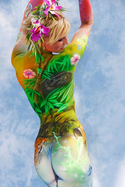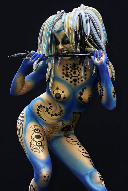 Tuval yerine çıplak modellerin vucutlarını kullanan boyama ustaları saatlerce süren çalışmalarından sonra eserlerini görüntülediler...