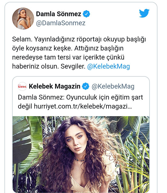 Oyuncu Damla Sönmez, Hürriyet'in yaptığı habere Twitter hesabından tepki göstererek, "Yayınladığınız röportajı okuyup başlığı öyle koysanız keşke..." paylaşımında bulundu.