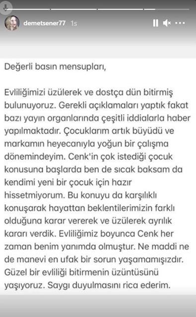 Sürpriz bir şekilde evliliğini noktalama kararı alan Şener, sosyal medya hesabından yaptığı açıklamada evliliklerinin çocuk isteme yüzünden bittiğini belirterek şu ifadeleri kullandı: