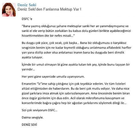 Deniz Sekinin tüm sevenleri için kaleme aldığı ve fan sosyal platformu Fanlove.comda kendisi adına açılan sayfasında yayınlanan mektup; sosyal medyada da günün en çok konuşulan konuları arasında yer aldı.