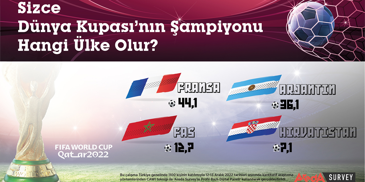 2022 Dünya Kupası’nda son dört belli olurken Areda Survey 1100 kişiye “Sizce Dünya Kupası’nın Şampiyonu Hangi Ülke Olur?” diye sordu. Türk halkının yüzde 44,1’i Fransa cevabını verdi.