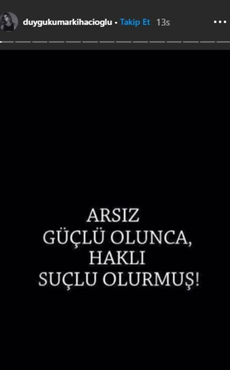 Duygu Kaya Kumarki önce sayfasında 'Arsız güçlü olunca, haklı suçlu olurmuş...' notunu paylaştı.