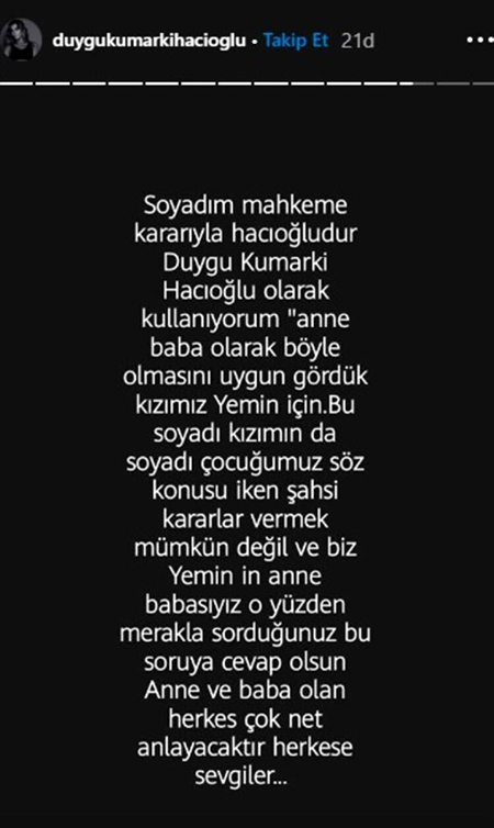 "Soyadım mahkeme kararıyla 'Hacıoğlu'dur Duygu Kumarki Hacıoğlu olarak kullanıyorum "anne baba olarak böyle olmasını uygun gördük kızımız Yemin için."