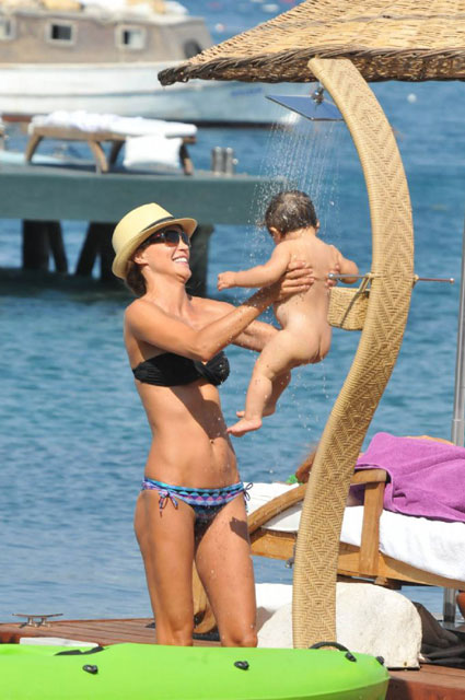 Pilates sayesinde doğum yaptıktan çok kısa bir süre sonra formuna kavuşan ünlü sunucu, minik bebeğini duş ünitesinin altında serinletti