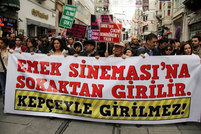 Kamuya ait Emek Sineması?nı yıkacak proje, 3 yıldır kültür sanat dünyasının ve sinemacıların şiddetli itirazlarıyla karşılanıyor. Kamer İnşaat adlı özel inşaat firmasına ait proje, ilk açıklandığı günden beri pek çok yürüyüşle protesto edildi. Dün de bu yürüyüşlerden biriydi.