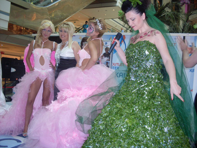 Kale Outlet Center'da düzenlenen defilede pop sanatçısı Uhde Seçil dünyada ilk kez üzeri maydanozla kaplanmış gelinlik giyerek podyuma çıktı.