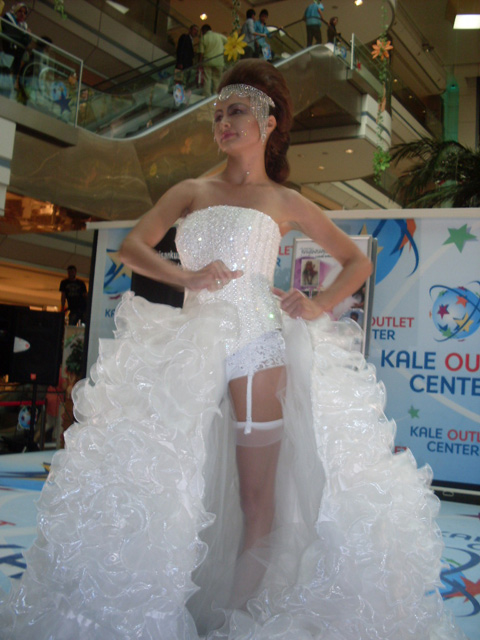 İlginç gelinlik defilesinde jartiyerli gelinlik giyen Asuman Şener podyumda gelinliğin eteğini çıkartarak jartiyeriyle kaldı.