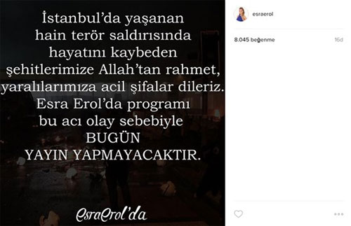 Ünlü sunucu Esra Erol, İnstagram'dan yaptığı paylaşımda yayınının iptal edildiğini açıkladı. İstanbul'da geçtiğimiz akşam gerçekleştirilen hain terör saldırısında 36'sı polis 44 vatandaş şehit düşmüştü.