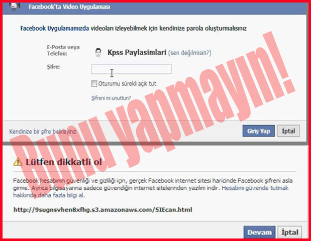 Tıklanması ve uygulama yüklemesinin gerçekleşmesi halinde ?Bu siz misiniz?? ?Doğrulama gerekiyor? gibi ekranlarda Facebook şifresi kesinlikle verilmemeli.