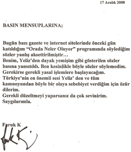 Katıldığı "Orada Neler Oluyor" programında konuşulmayan sözler, konuşulmuş gibi gazete ve manşetlere taşınınca Faruk K, buna yazılı bir açıklama göndererek isyan etti...