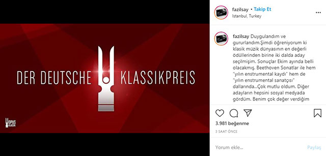 Ödüle aday gösterildiğini sosyal medya hesabından duyuran Fazıl Say, duygularını şöyle ifade etti: