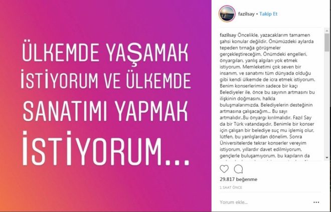 İktidarın birçok belediyesi tarafından ambargo uygulanan Say’ın 14 Ağustos’ta vereceği konser iptal edilmişti. Say, bu duruma tepki gösteren bir yazı yayınladı.