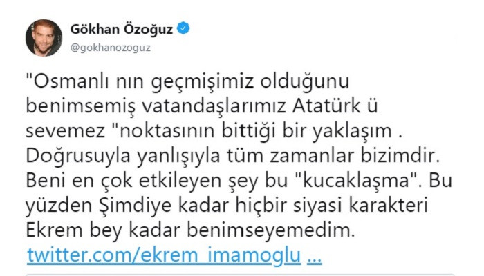 Athena müzik grubunun solisti Gökhan Özoğuz, İstanbul Büyükşehir Belediye Başkanlığı'na seçilen Ekrem İmamoğlu ile ilgili olarak sosyal medya hesabı Twitter'da yaptığı paylaşımda, "Hiçbir siyasi karakteri Ekrem bey kadar benimseyemedim" dedi.