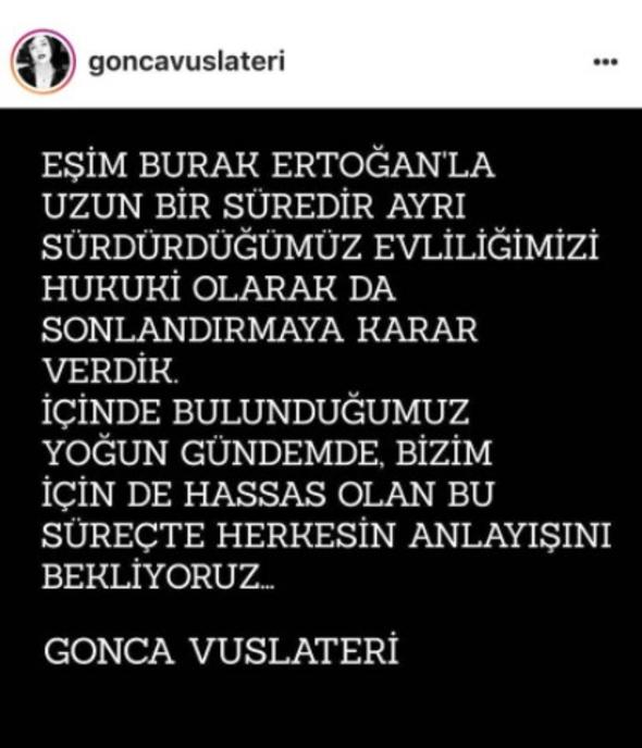 Gonca Vuslateri yaptığı açıklamada, “Bir süredir ayrı sürdürdüğümüz evliliğimizi hukuki olarak da sonlandırmaya karar verdik” dedi