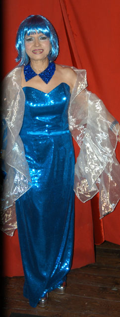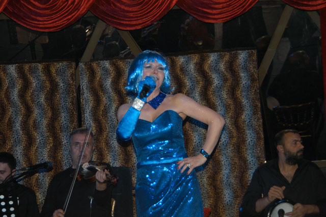 Mavi dekolte kostümü ile göz kamaştıran sanatçı farklı imajıyla dikkat çekti. Kostümüne uyumlu olması için mavi peruğu tercih eden Gülden Karaböcek, bir hayranının kaptan şapkasını uzatmasının ardından ortaya ilginç görüntüler çıktı. Cahide kızlarının uzattığı pembe gözlüğü de takan Gülden Karaböcek, "Bugün Aysel Gürel gibi oldum, çılgın günüm demek ki" dedikten sonra esprilerine devam etti.