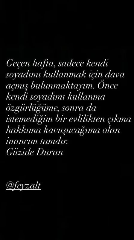 Önce kendi soyadımı kullanma özgürlüğüme, sonra da istemediğim bir evlilikten çıkma hakkıma kavuşacağıma olan inancım tamdır" ifadelerini kullandı ve avukatı Feyza Altun'u etiketledi.