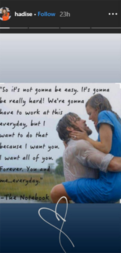 Hadise ise son paylaşımıyla adeta iddiaları yalanladı.Şarkıcı, The Notebook filmindeki, "Kolay olmayacak.