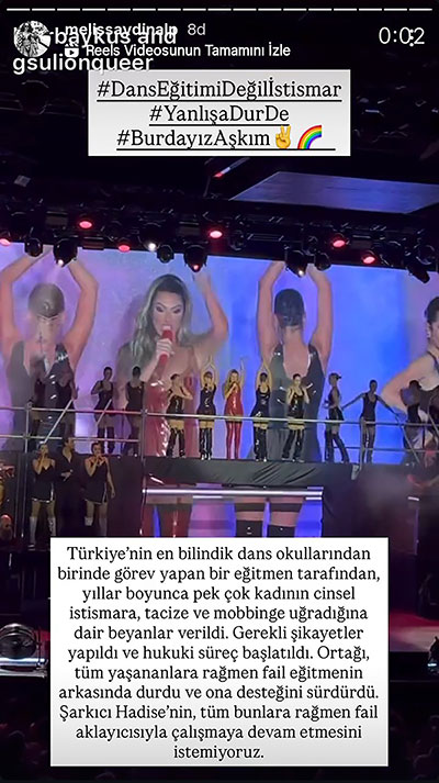“Teşhircilik” suçlamasıyla sık sık gözaltına alınan manken aktivist Melisa Aydınalp , Hadise'yi etiketleyerek "Türkiye’nin en bilindik dans okullarından birinde görev yapan bir eğitmen tarafından, yıllar boyunca pek çok kadının cinsel istismara, tacize ve mobbinge uğradığına dair beyanlar verildi. Gerekli şikayetler yapıldı ve hukuki süreç başlatıldı. Ortağı, tüm yaşananlara rağmen fail eğitmenin arkasında durdu ve ona desteğini sürdürdü. Şarkıcı Hadise’nin, tüm bunlara rağmen fail aklayıcısıyla çalışmaya devam etmesini istemiyoruz" dedi.