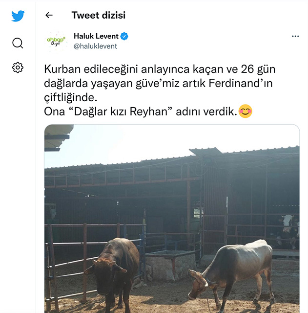 Levent, Twitter paylaşımında, "Kurban edileceğini anlayınca kaçan ve 26 gün dağlarda yaşayan düvemiz artık Ferdinand çiftliğinde.