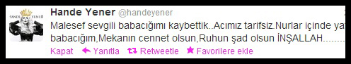 Hande Yener babasının vefatını kendi Twitter hesabından şu şekilde duyurdu...